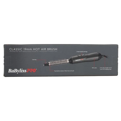 2-in-1 blow-dry and style! BaBylissPRO Classic Hot Air Brush creates bouncy curls, luscious volume or sleek smoothness while you blow-dry. The powerful 700 watt motor gives you freedom to style as you desire. This timesaving, multitasking hot brush features a tourmaline ceramic barrel for sensational smoothness and shine. Ball-tipped bristles glide through hair without damage. 2 heat/speed settings suit all hair types. Yet another reason why BaBylissPRO is all about superior professional performance.