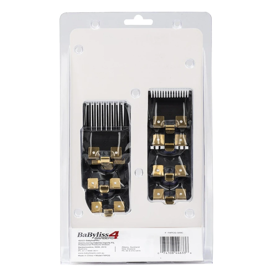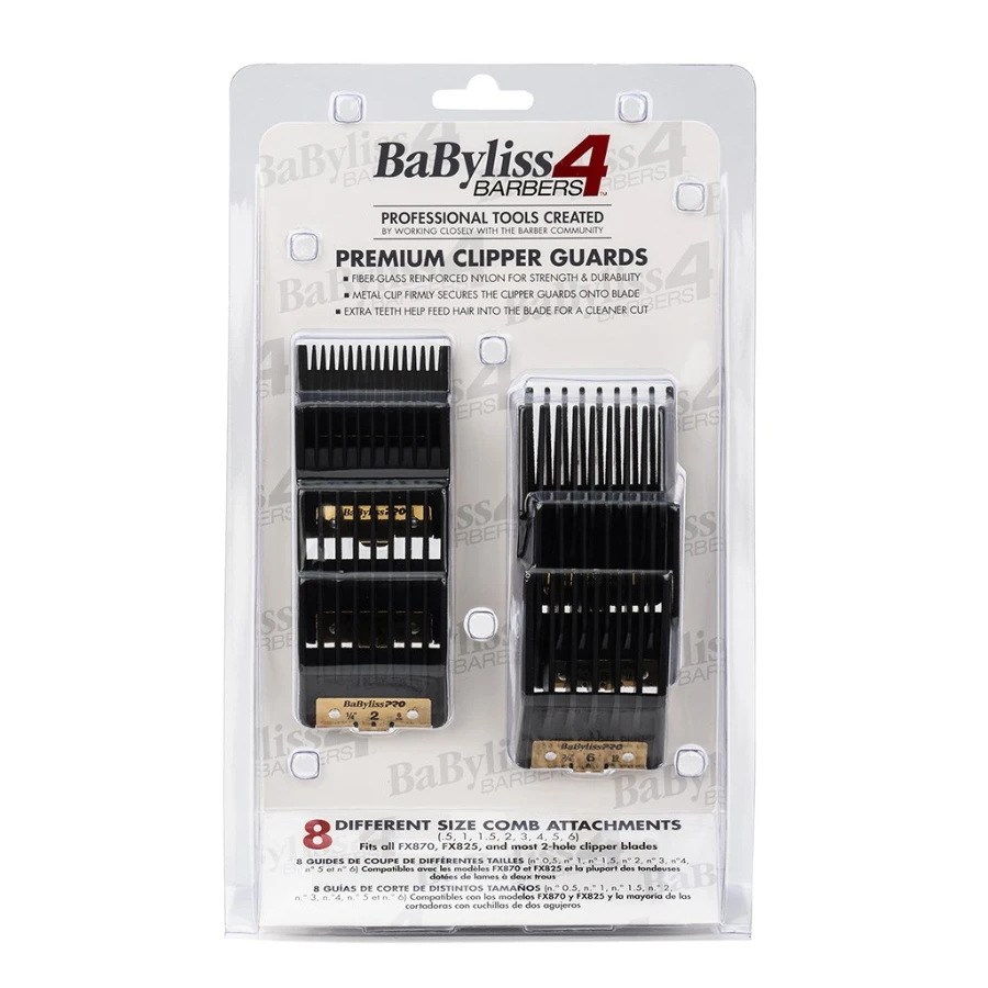 By working closely with the barber community, the BaBylissPRO Premium Hair Clipper Comb Attachments were created. These premium hair clipper guards are formed from fiberglass-enforced nylon for strength and durability. A metal clip firmly secures the clipper guards onto the blade. Extra teeth help feed hair into the blade for a cleaner cut. Designed to fit FX870 BaByliss PRO Lithium Metal Hair Clippers, FX825 BaBylissPRO LoPROFX Hair Clippers and most 2-hole clipper blades.