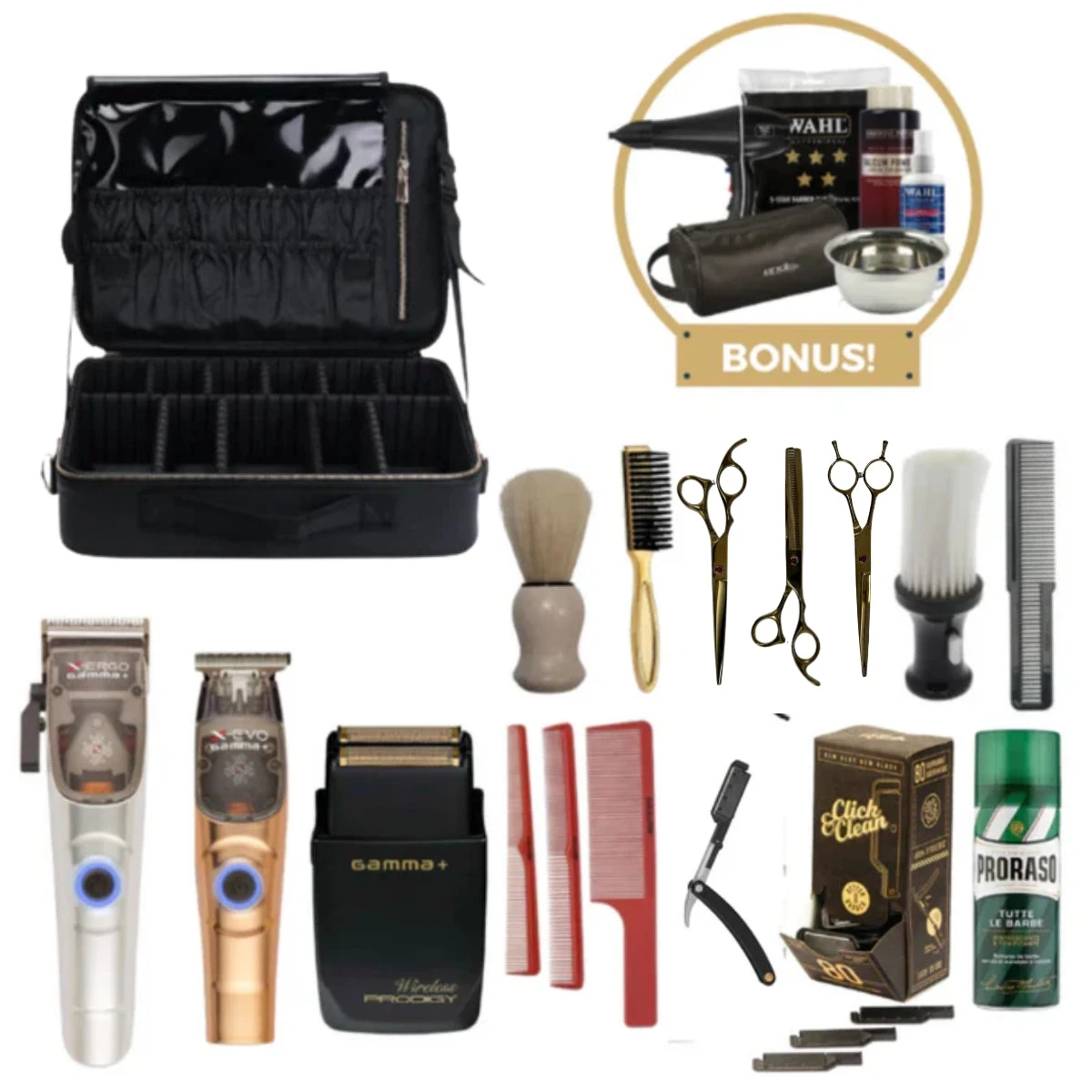 The complete all new BarberCo Platinum Gamma Barbering Kit. Includes the much sought after Gamma X-Ergo Clipper, X Evo Trimmer & Prodigy Shaver and our own BarberCo Black Case. Settle for nothing less than a full professional haircutting set ready to be put into immediate use!