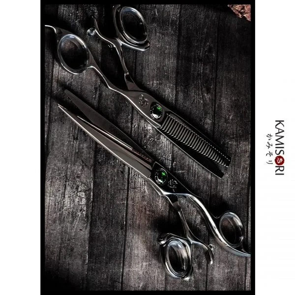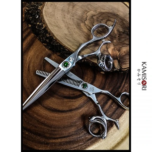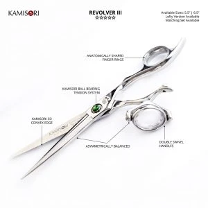 The all-new revolver has been in the works for over two years and is now finally here! Designed to meet the needs of advanced hair-artists seeking ergonomic tools, the all-new Kamisori Revolver model is the ULTIMATE professional swivel hair cutting shears! Ultra-smooth ring-to-tip operation, flexible Japanese forged steel, ball-bearing tension system, and an anatomic double-swivel handle. This model is a must for those professionals looking for high-end swivel shears that will last a lifetime.