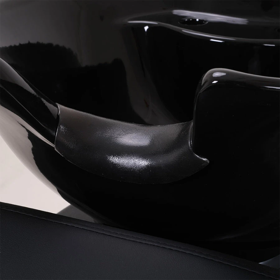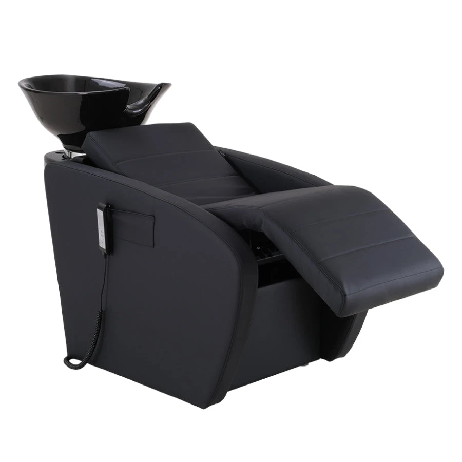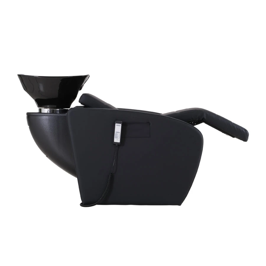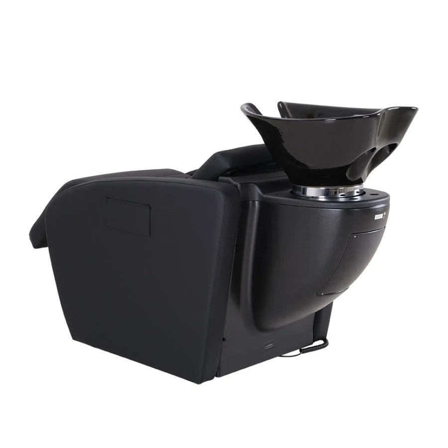 A sleek, shampoo station chair with a padded, contoured seat and leg rest designed for client comfort. It features an adjustable, tilting basin with a neck groove, a handheld sprayer, and integrated storage, ideal for efficient and stylish salon setups.