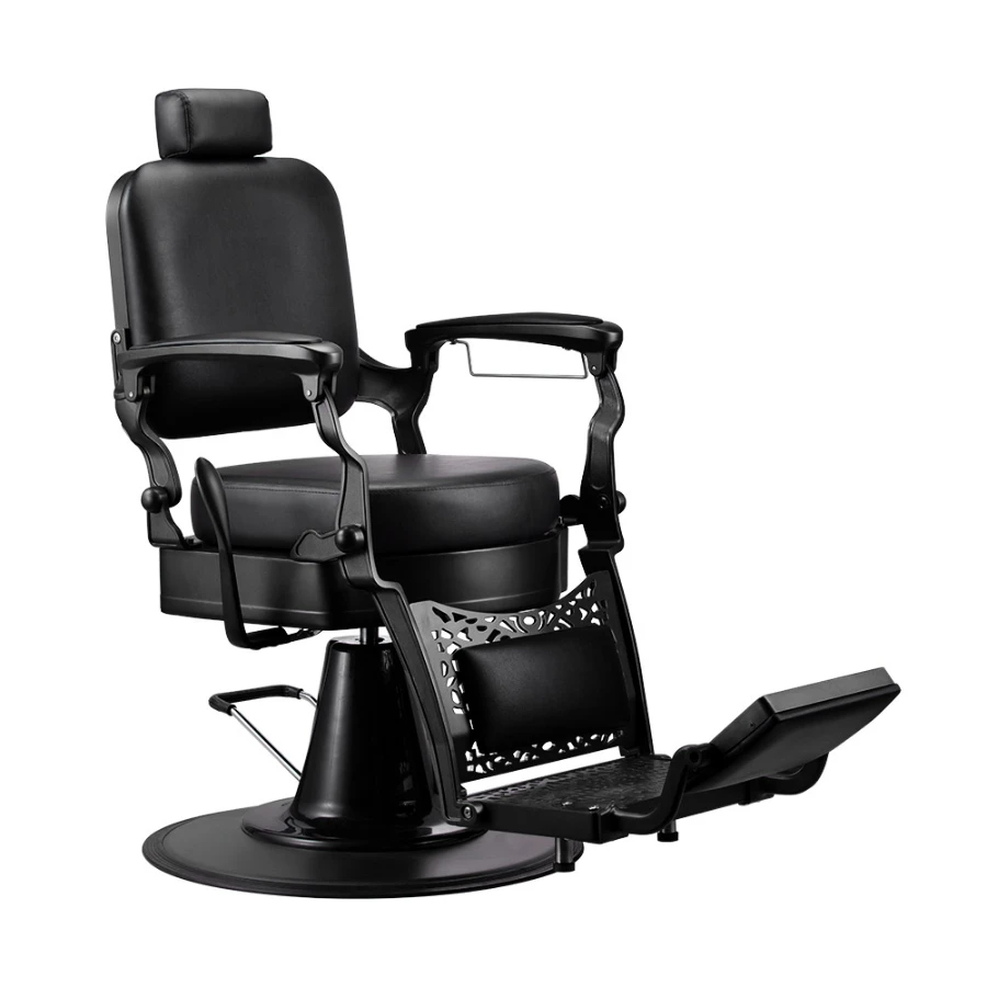 This barber chair features an opulent design with intricately patterned metalwork. The plush upholstery ensures maximum comfort, while the chair includes an adjustable headrest, reclining back, and a heavy-duty hydraulic lift. The robust footrest and armrests add to the clientโs ease, making this chair a blend of luxury and functionality for any upscale salon.