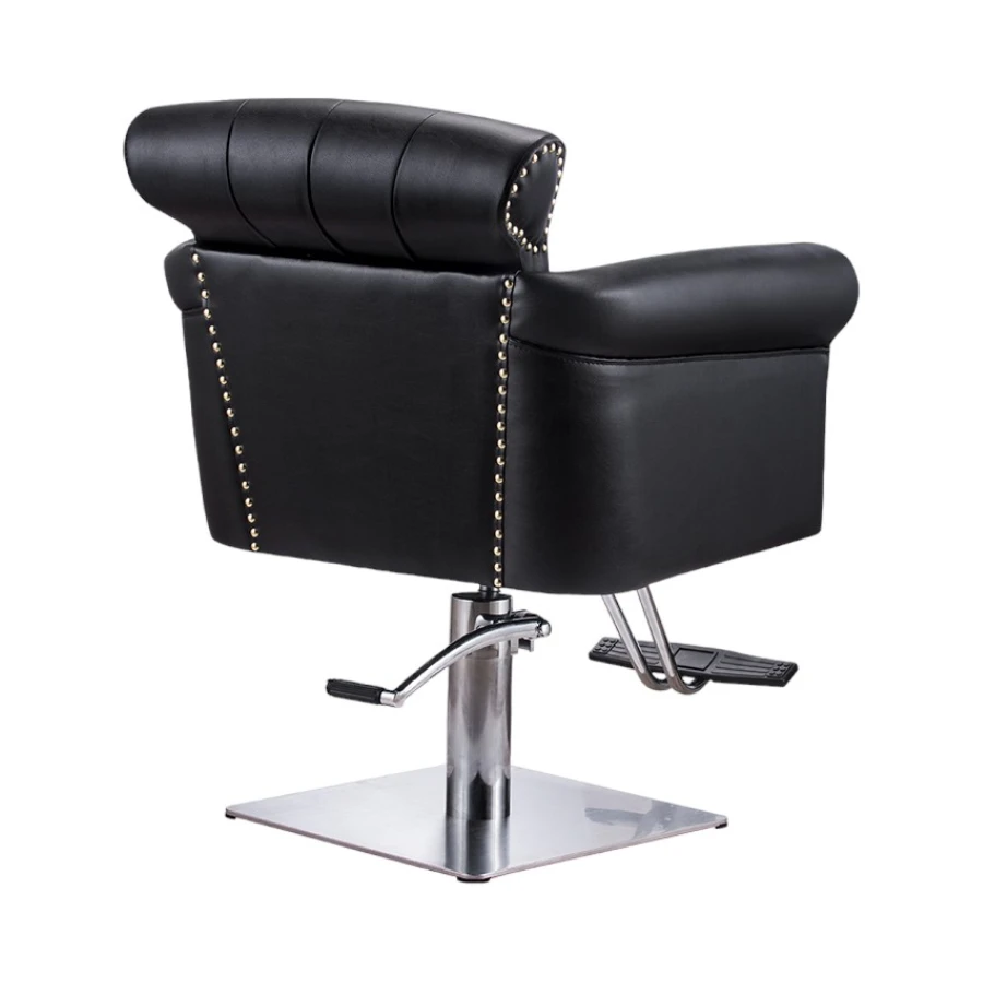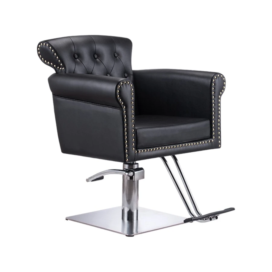 Stylish salon chair with classic button tufting and elegant stud detailing, featuring armrests for support, all atop a sturdy, height-adjustable metal base.