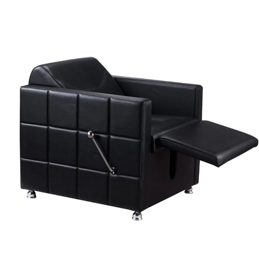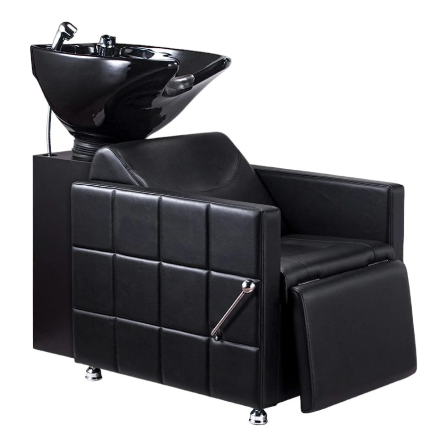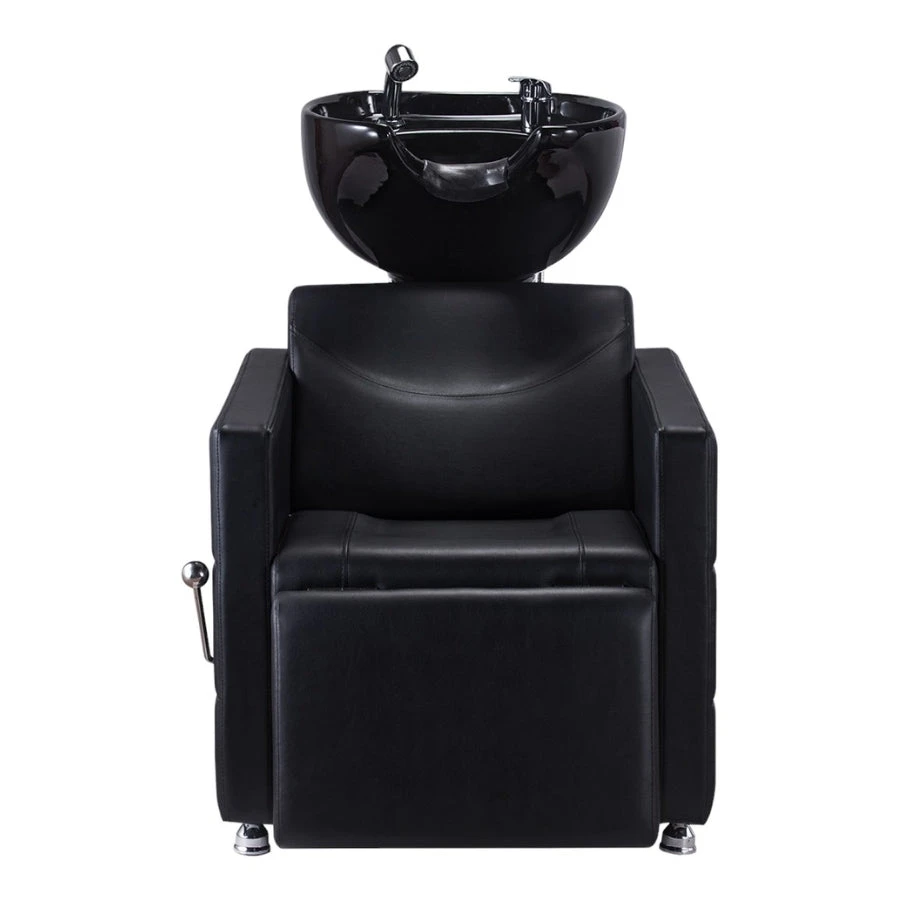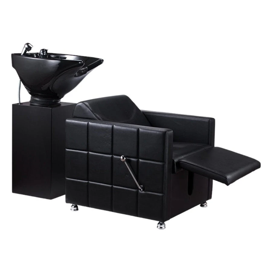 Featuring a modern design with a tufted, cushioned back and squared armrests, this shampoo station offers a comfortable and stylish experience. It comes with a streamlined basin, providing convenience and functionality for any salon setting.