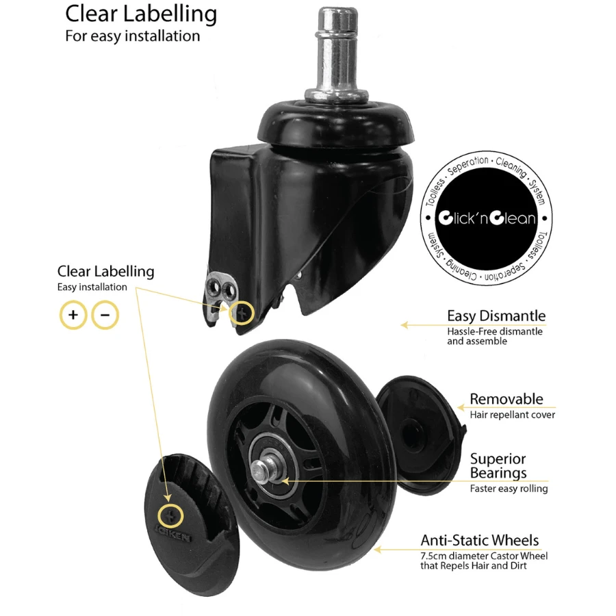 • The new unique Click’n Clean system will also allow you to clean your stool or trolley wheels in minimal time when compared to your present wheel castor.