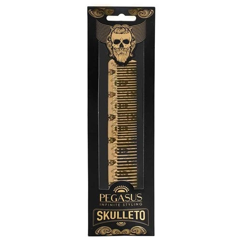 The styling comb with style! Introducing the Pegasus Skulleto 202 Styling Comb in Gold with signature Pegasus skull print. This good looking comb is also smart, thanks to seamless, perfectly rounded teeth which move in response to changing temperatures, ensuring hair glides through the comb without damage. Flexinite is one of the best new technologies in the world for styling, cutting and simply combing through hair. Pegasus Skulleto 202 Styling Comb in Gold is perfect for combing large sections of hair. Features two widths of teeth for different hair thicknesses.