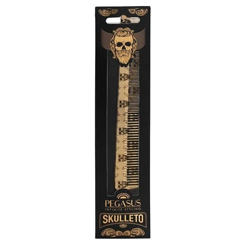 Styling in super cool style. Introducing the Pegasus Skulleto 303 Barber Comb Tapered with Flexinite. What’s Flexinite? Well, it’s smart comb technology with seamless teeth which ensures hair glides through the comb without damage. With signature Pegasus skull print in gold, this comb combines a cool look with one of the best new technologies in the world for styling, cutting and simply combing through hair. Great for use while cutting, barbering, scissor over comb techniques and edges. Features two widths of teeth for different hair thicknesses.